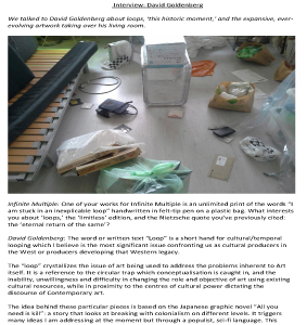 Presentation of new 4 new versions of texts on temporal/cultural looping on waste bags plus T-shirt versions